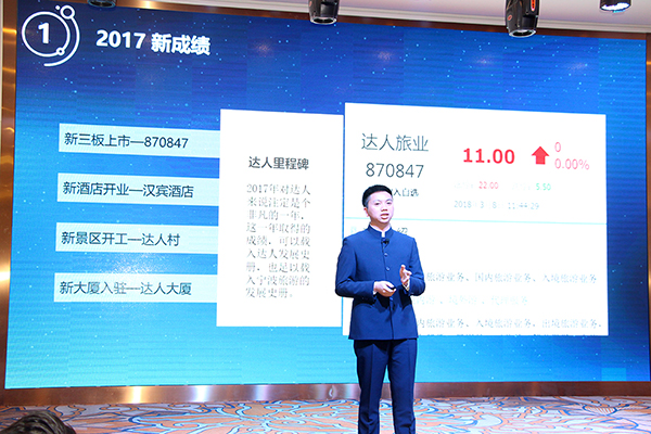 达人旅业总裁童伟标在年会上做出高水平、有情怀的精彩致辞。总结过去一年所取得成绩,童总自豪地表示,“2017是达人的非凡之年,新三板上市、新酒店开业、新景区开工、新大厦入驻,这一年取得的成绩,可以载入达人旅业的发展史,也足以载入宁波旅游发展的史册。”