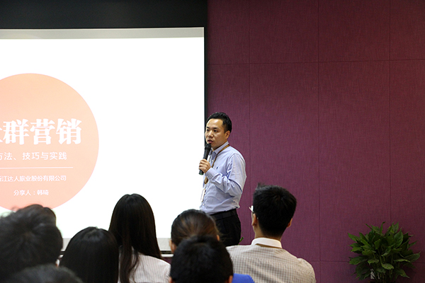 4月12日晚,达人旅业《社群营销》培训会暨储备干部、管培生课堂在达人厅如期而至。副总裁韩琦以社群营销的方法、技巧与实践为主题,结合自己丰富的营销经验和高水平营销能力为大家带来充实的一课。