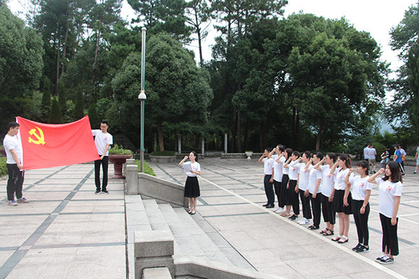 忆党史、学党章、重温入党誓词、缅怀先烈。在“七一”这个庄严而光荣的时刻,党员们登上四明山烈士陵园,祭扫烈士纪念碑,向抗战时期牺牲的烈士们致以崇高的敬意。巍峨的纪念碑和四周苍劲的柏树让人肃然起敬,站在革命烈士纪念碑下,全体党员深深三鞠躬并默哀,在党旗下重温入党誓言,在宣誓声中共同表达对共产党的无比忠诚和对革命烈士牺牲精神的无限敬佩。