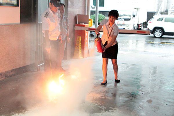 在演练时,先由安全员对参与人员演示了灭火器的正确使用方法、步骤和灭火姿势等,然后安排各公司人员现场实操灭火,由安全员对实际操作中出现的错误姿势进行指导,使大家掌握灭火器使用正确要领。