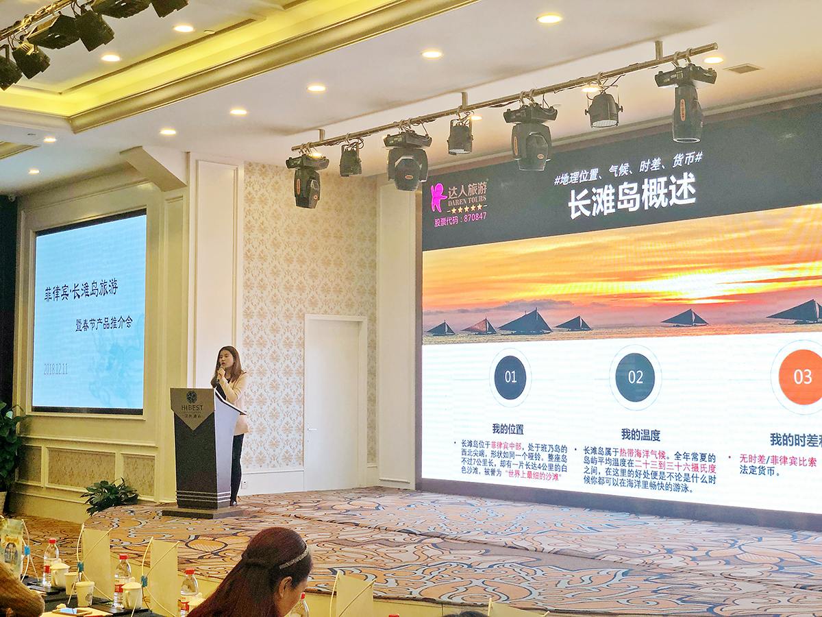 12月11日,由浙江达人旅业股份有限公司举办的“菲律宾长滩岛旅游暨春节产品推介会”,在宁波汉宾酒店圆满落幕。来自宁波及周边地区的200余位旅行商出席会议,浙江长龙航空张杰及菲律宾国家旅游局负责人雷亚司、王洁琼到场与大家面对面交流。会议由达人旅业副总裁沈永军主持召开。