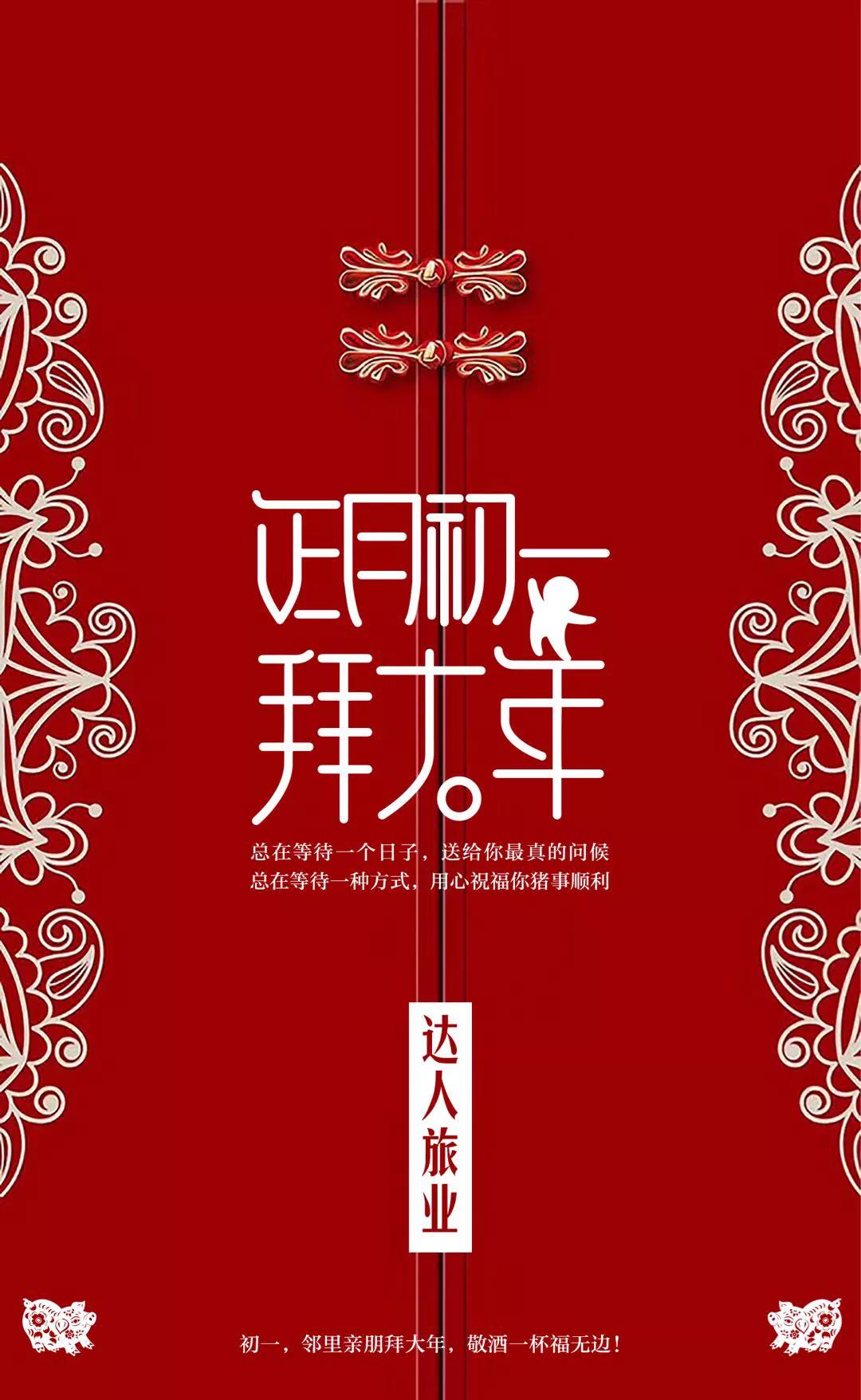 朱门北启春色,紫气东来吉祥,达人旅业恭祝您全家新春快乐,“猪”事顺利!