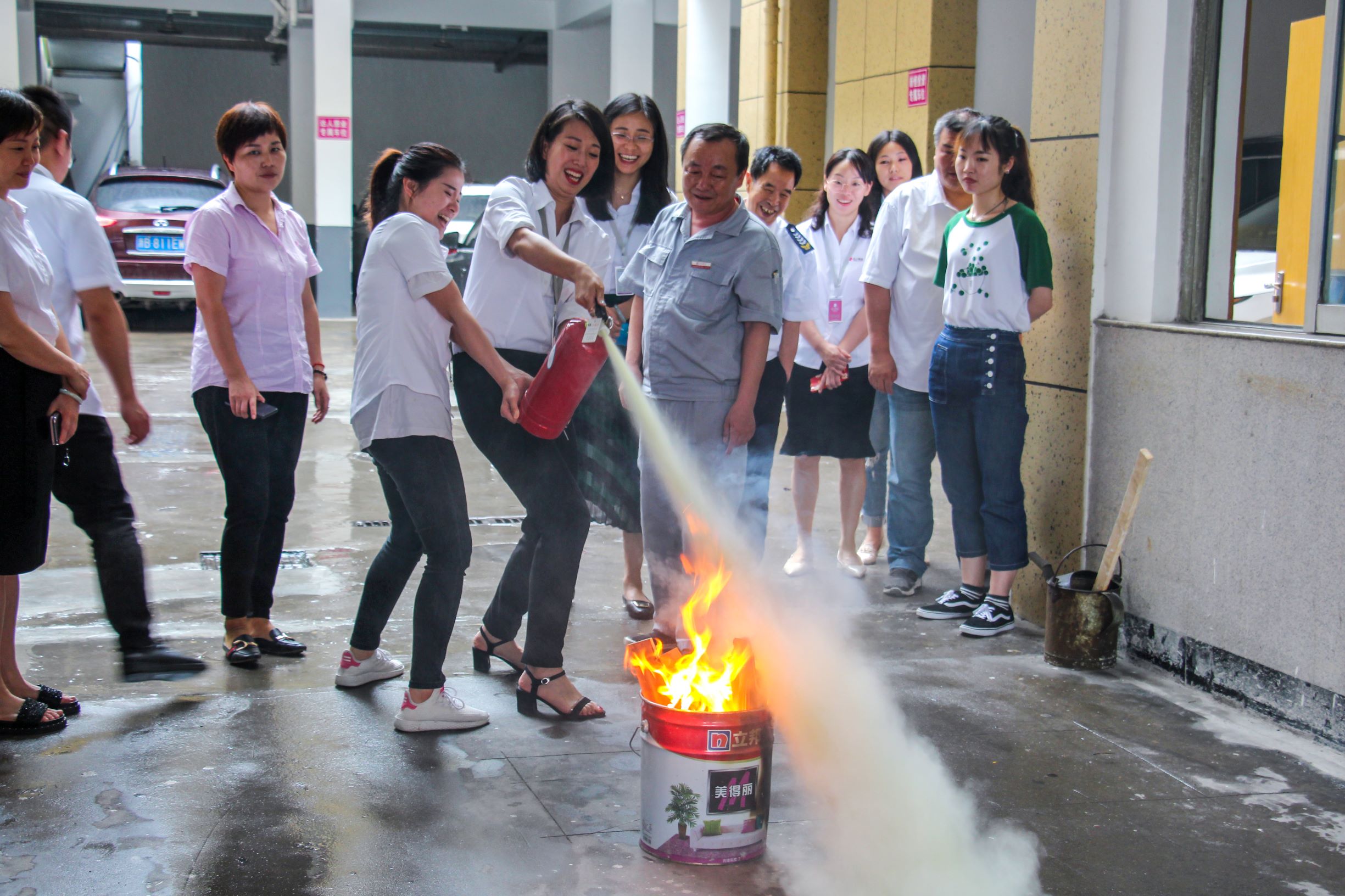 随后安全员示范了灭火器的正确使用方法。在安全员的指导下,员工积极参与,轮番使用灭火器进行消防演练。