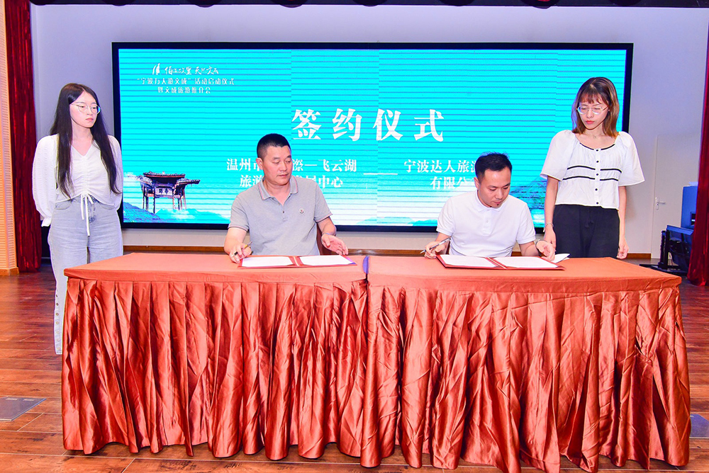 达人旅业执行总裁韩琦出席推介会,并与温州市百丈漈-飞云湖旅游经济发展中心达成战略合作、签订协议,加强两地业界的合作。