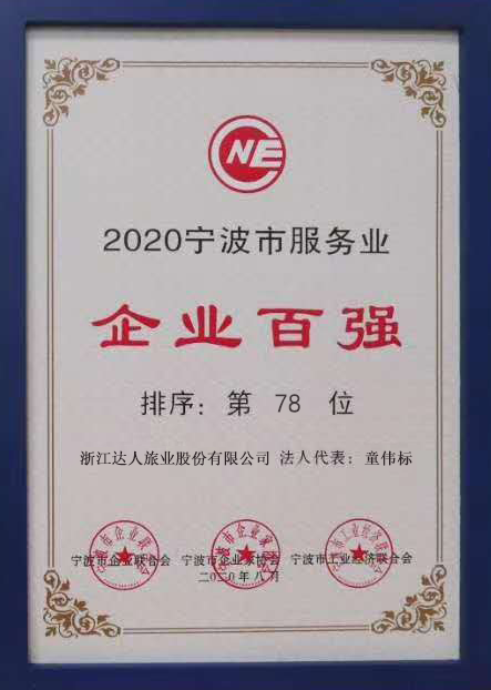 8月27日,由宁波市企业联合会、宁波市企业家协会、宁波市工业经济联合会共同推出2020宁波企业百强榜,达人旅业荣登“2020宁波市服务业企业百强”。