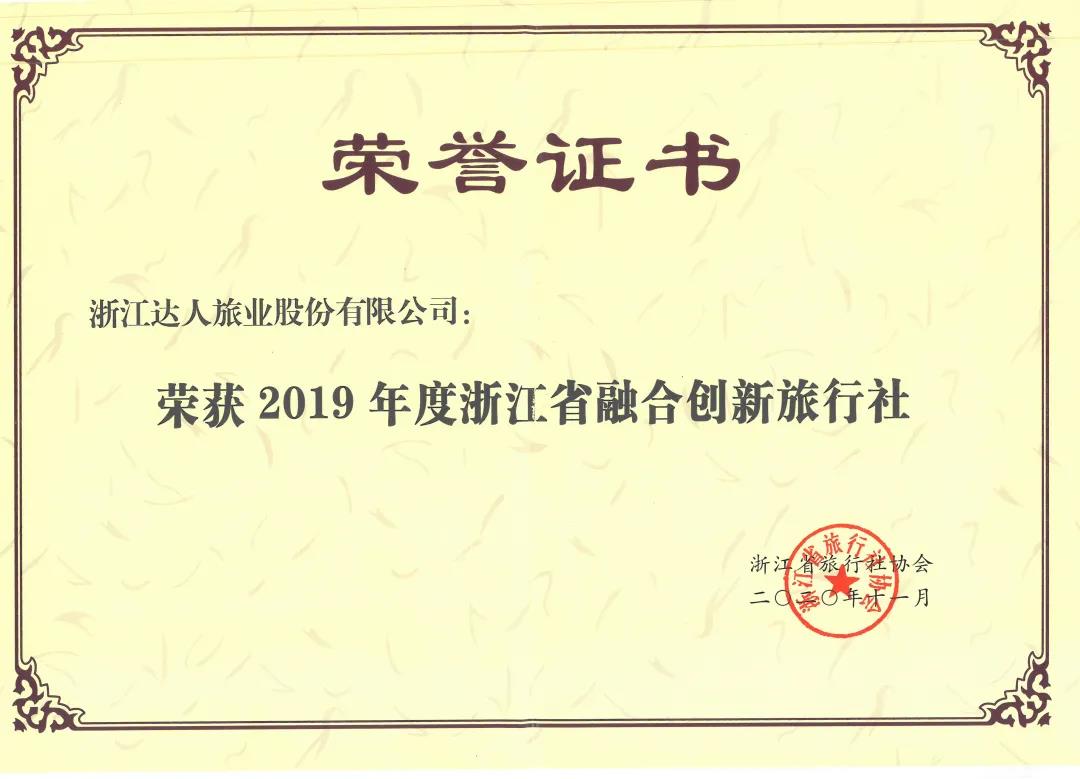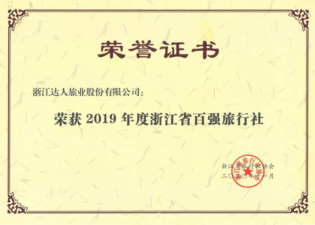 由浙江省旅行社协会开展的2019年度浙江省百强旅行社等奖项的评比活动,在经活动专家小组和广泛征求意见后,浙江省百强旅行社名单火热出炉,达人旅业登榜第19名,并荣获2019年度浙江省融合创新旅行社称号。