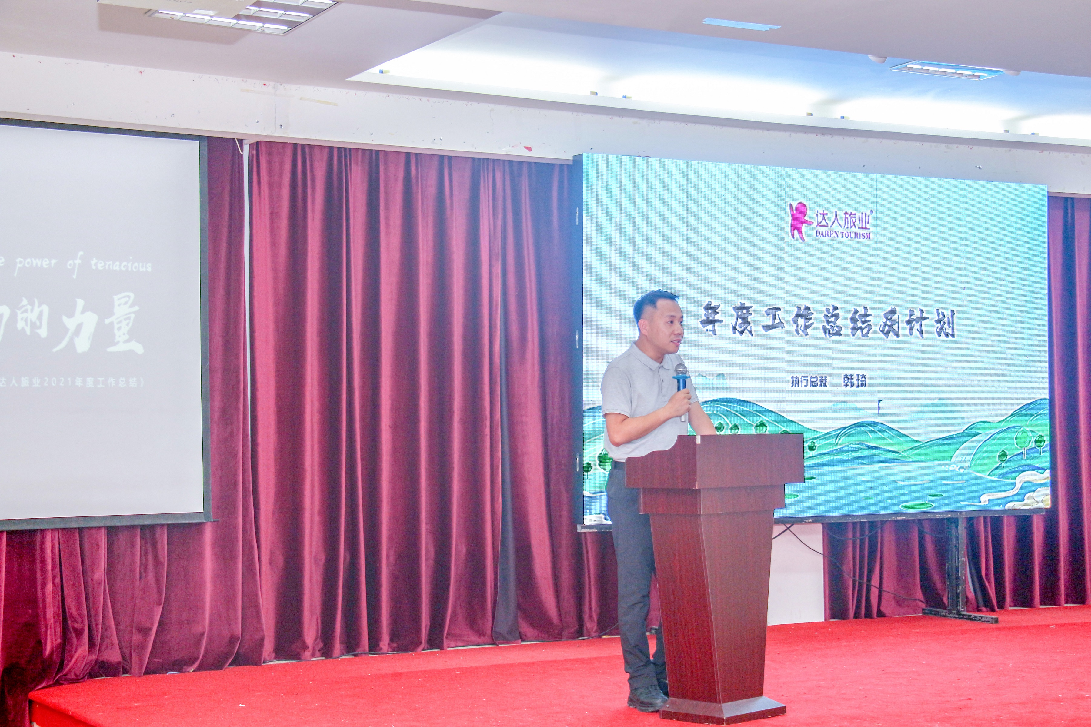 大会伊始,达人旅业执行总裁韩琦向全体与会人员作2021年经营总结及2022年经营计划的工作汇报。2021年是公司迈进“四五”发展规划的第一年,全年充满挑战,达人们共克时艰,实现了公司高质量发展。2022年,韩总会上提出了文旅融合、微度假、项目管理、乡村振兴的发展关键词,面对新的发展局势,唯有围绕全年的关键词,在坚守的同时,不断创新才是正确方向。