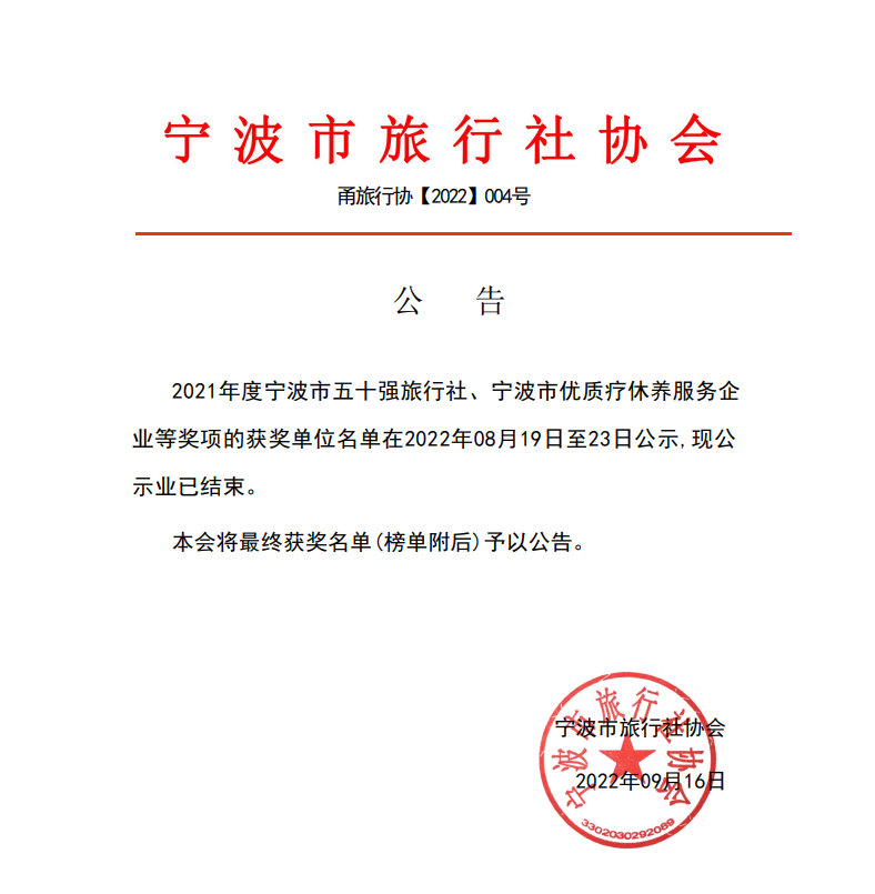 日前,经过评审专家组评议、广泛征求意见和对外公示等程序,宁波市旅行社协会正式发布2021年宁波市旅行社行业先进评选结果,