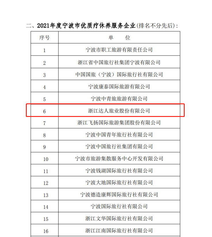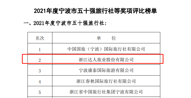 浙江达人旅业股份有限公司成功获评“2021年度宁波市五十强旅行社”、“2021年度宁波市优质疗休养服务企业”两大项荣誉。