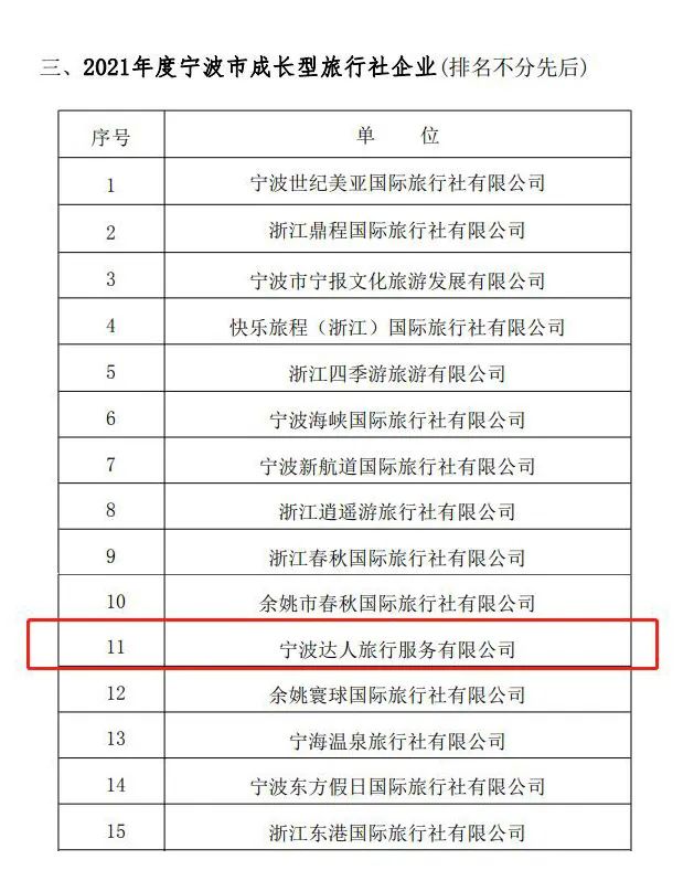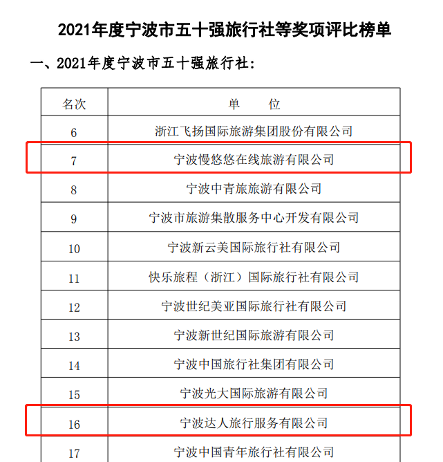 ”。两家公司也同时上榜“2021年度宁波市五十强旅行社”。