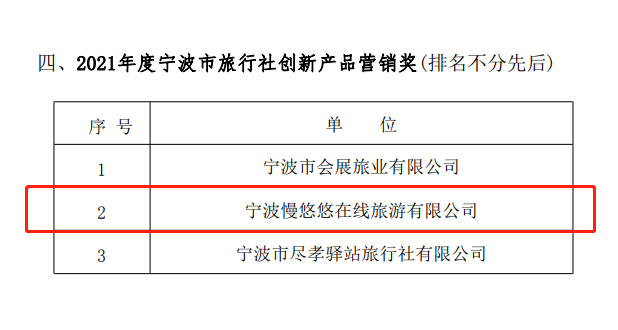 2021年度宁波市旅行社创新产品营销奖