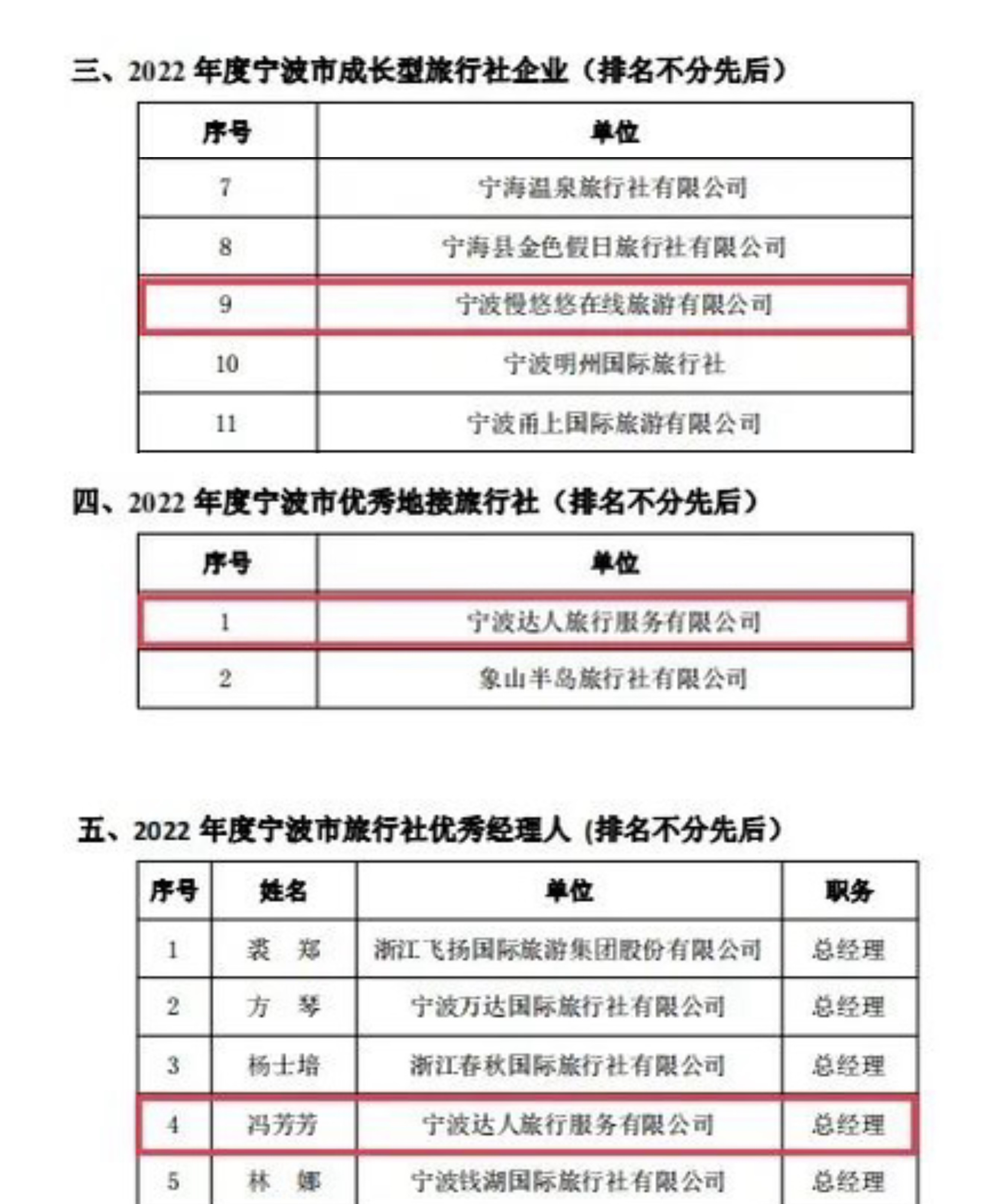 同时,宁波达人旅行服务有限公司总经理冯芳芳更是荣获“2022年度宁波市旅行社优秀经理人”称号。